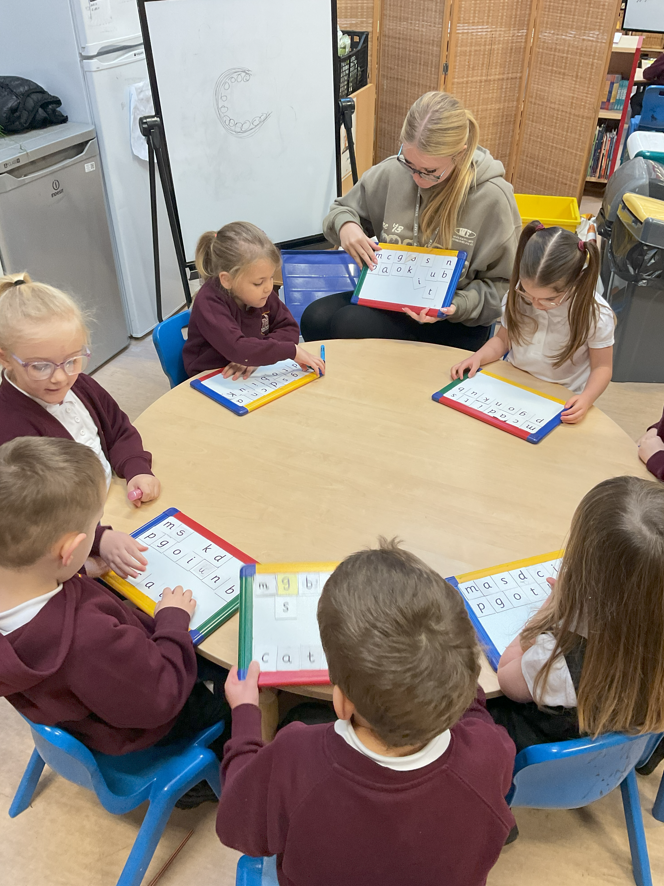 Alongside teaching children sounds, we teach them to blend sounds to read words e.g. s-a-t, sat.
